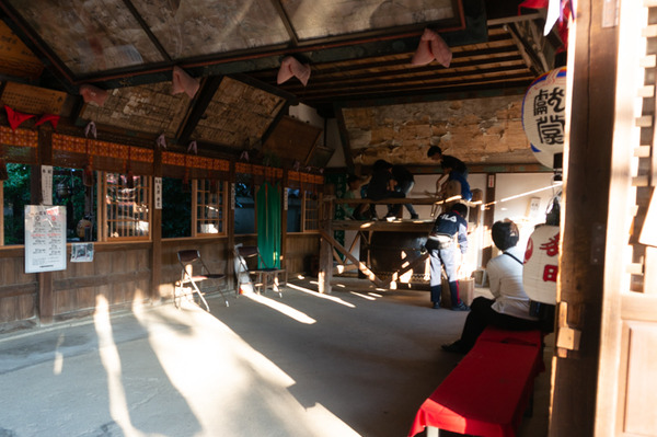 拝殿内では、子どもたちが力強く太鼓を打ち鳴らしていました。