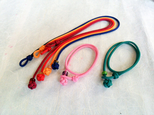 紐のはしに、あわじ結びであわじ玉と巻き結びを作るだけで、かわいいブレスレットが作れちゃいます!!自分の好きな色を選んで、お友達や家族と色違いのブレスレットを作ろう!!