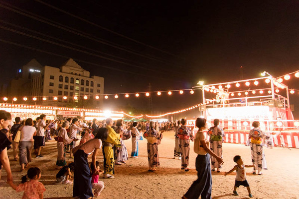 会場内中心にはやぐらがあり、その周りには盆踊りをしている方々が。