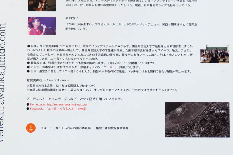 また音楽イベント「エ〜音(ね)!くらわんか」では初田悦子さんをはじめとする意賀美神社でのライブや、熊本の食材をつかったスイーツ販売や、枚方・熊本産の野菜の販売等もある「エ〜音!くらわんかマルシェ」などのイベントも同時開催予定のよう。