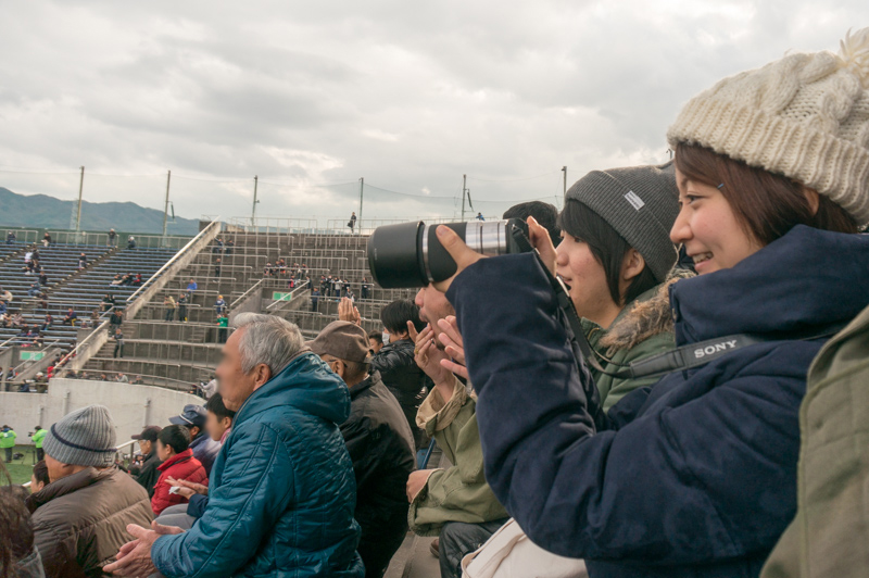 見えにくいですが、ピンクの服を着た集団の辺りにボールが。キックは成功し、東福岡高校が先制![]()