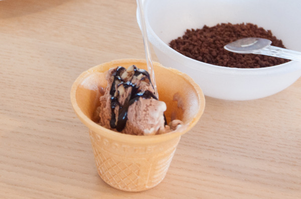 (アイスはバニラ・チョコ・ストロベリー、3つの味を堪能)