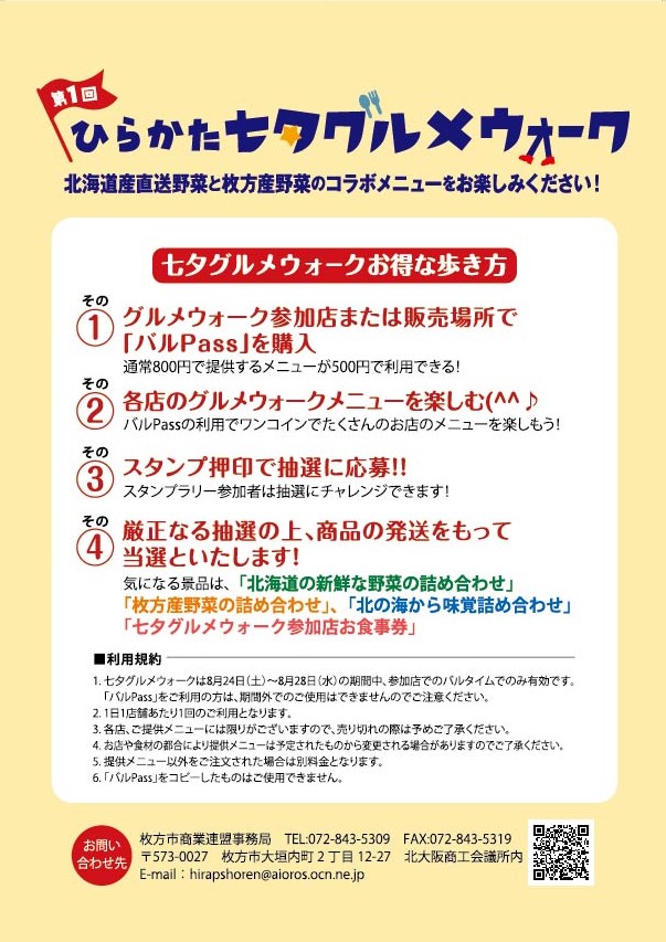 枚方市内の23店舗で「第1回 ひらかた七夕グルメウォーク」という北海道と枚方コラボメニューが食べられるイベントが開催されます。