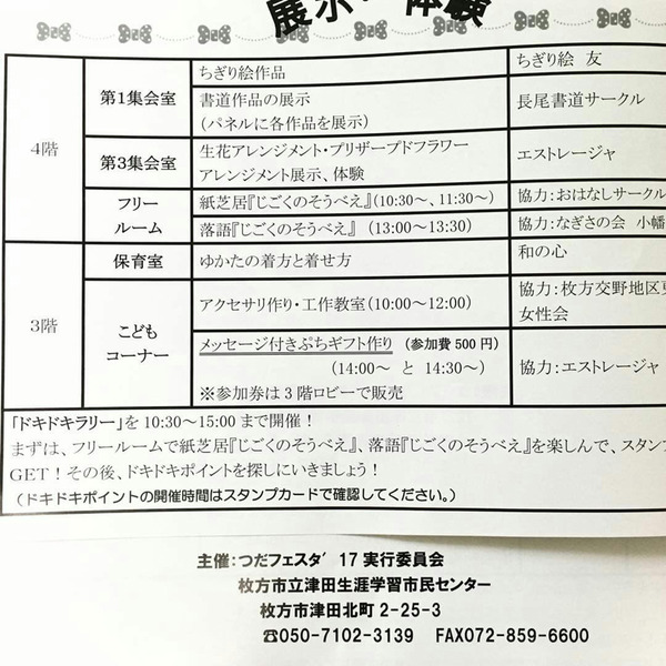 津田生涯学習市民センターで「つだフェスタ’17」というお祭りが開催されるようです。