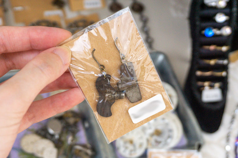 目覚まし時計のネジ巻きパーツを使ったピアスもありました。