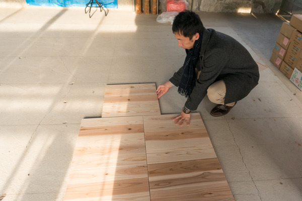「ひらば」4階・5階床に杉の木のパネルを敷き詰めていきます!
