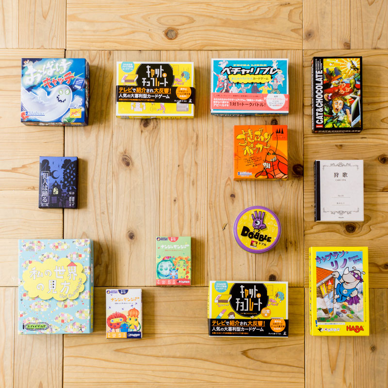上記写真のようなトランプタワー的なものを崩さずにつみあげるジェンガの類のゲームから、大喜利っぽいもの、頭をつかう騙し合い、タイトルに書いたJPOPの歌詞でカルタするゲームなどいろんな種類があります!