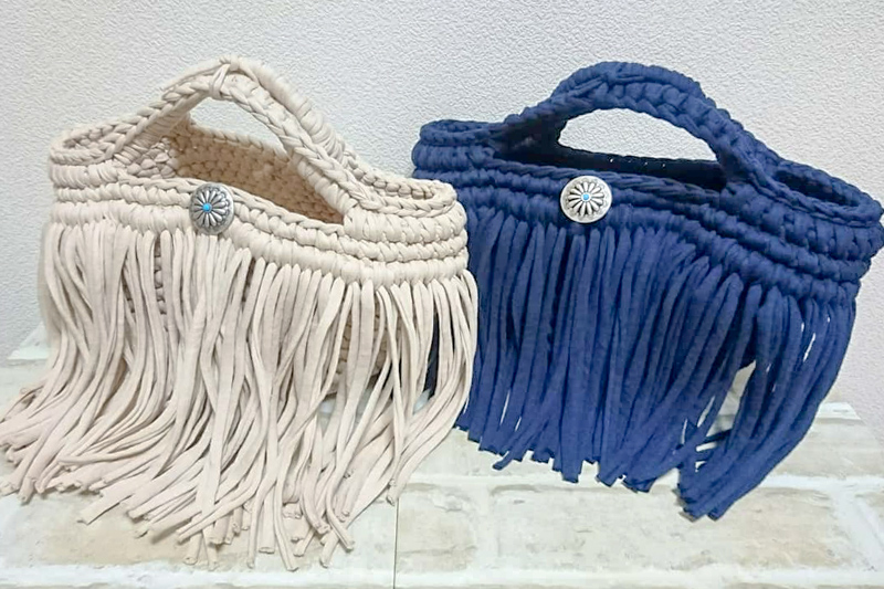 流行りのズパゲッティ等のアップサイクルヤーンで編んだバッグや、アクセサリー等の販売です。