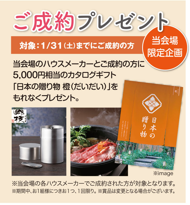 ※モデルハウス1棟以上ご見学の方が対象。※抽選会はお1人様1回限り。※参加賞はお1組様お1つずつ限り。※賞品がなくなり次第終了。※画像はイメージです。