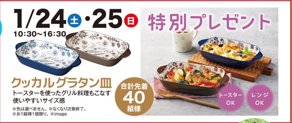 電子レンジ&トースターで加熱調理ができるクッカルグラタン皿を先着40組様にプレゼント♪