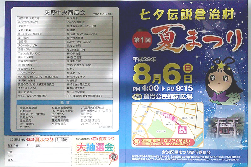 七夕伝説倉治村 第1回夏まつり | 倉治公民館前広場 →地図 →張り紙 |