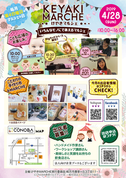 けやきマルシェとは2011年の5月から始まり、毎月第4日曜日に枚方市の香里ケ丘にあるCONOBAで開催されています。