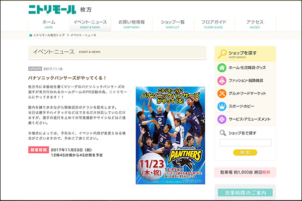 ニトリモール枚方にパナソニックパンサーズの選手たちがやってくるようです。