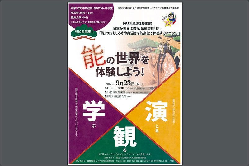 今回のイベントは9月23日(祝・土)の14時より開催で、枚方市内在住・在学の小中学生が無料で辰巳満次郎さんと一緒に能を体験できるといった内容です。