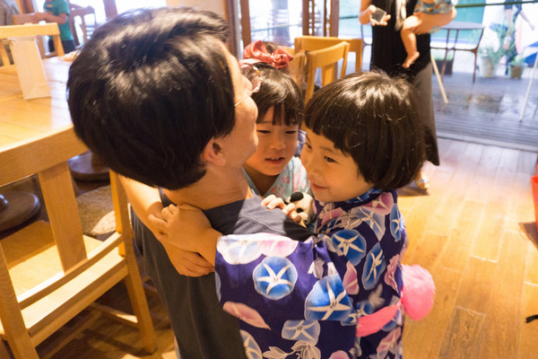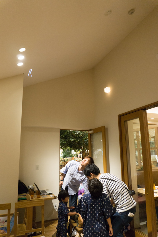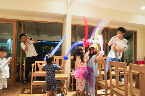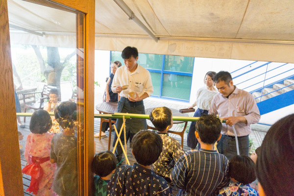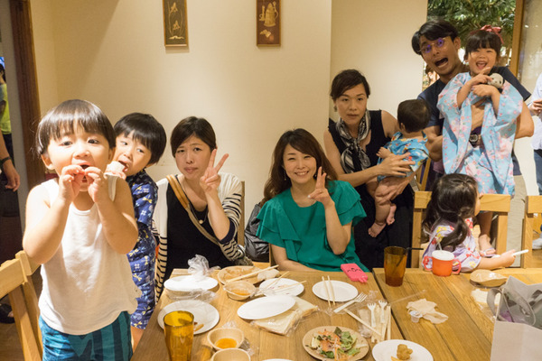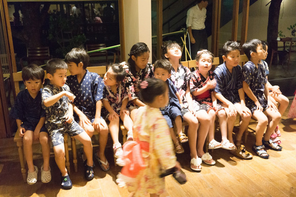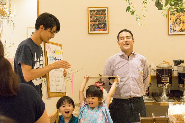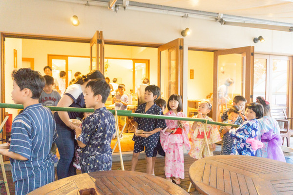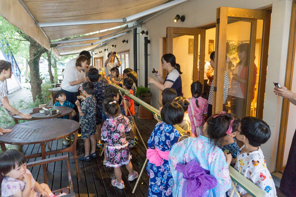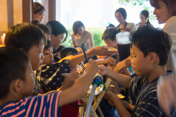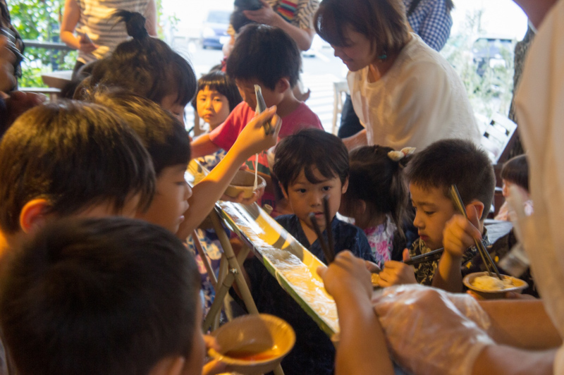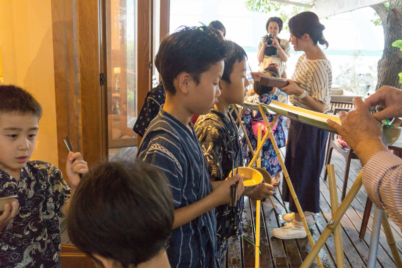 テラスで流しそうめんに夢中になってるこどもたちの横では
