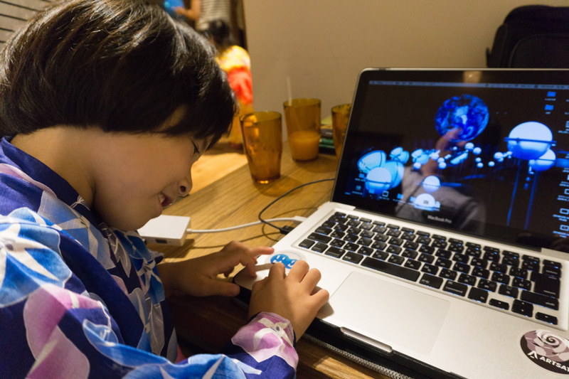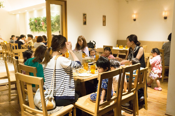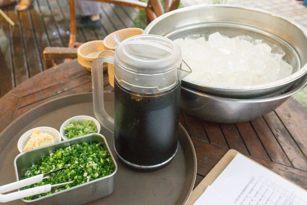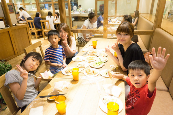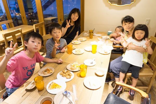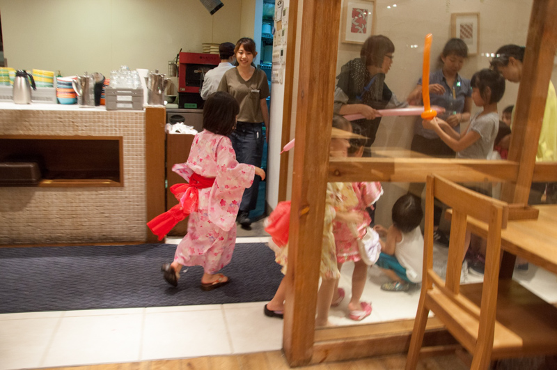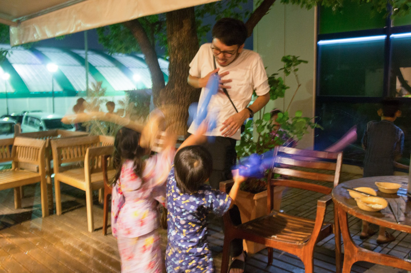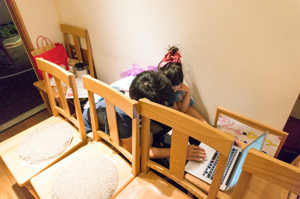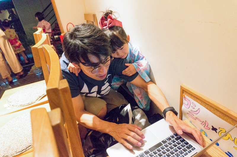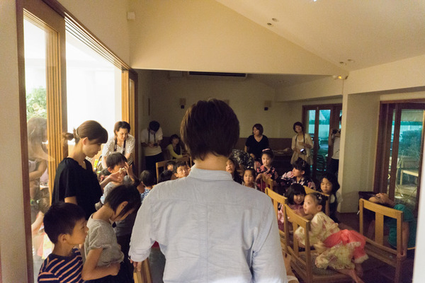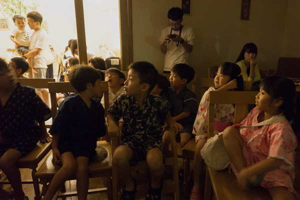 テラスで流しそうめんに夢中になってるこどもたちの横では