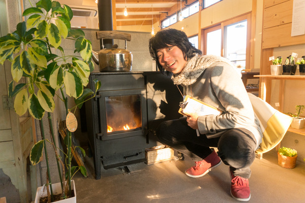 スタッフさん:これ、「ペレットストーブ」って言って木屑を圧縮したものを燃料にしてるストーブなんです。ゼンマイ仕掛けで自動で燃料の木屑が落ちていくストーブなんです。この音はその音。