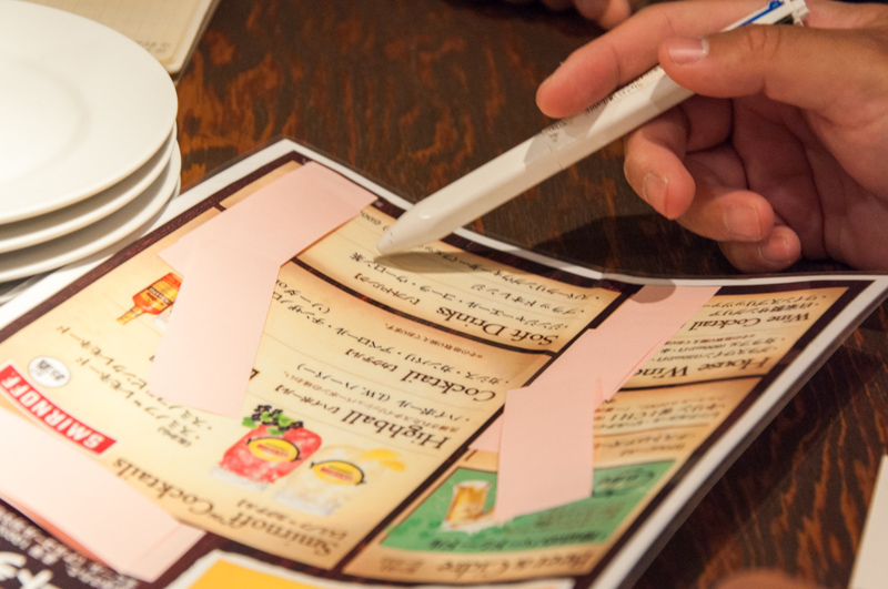 メニューには、お店の方から許可をもらって今回のジャッジウーマンおさやが付箋を貼り付けていきます。