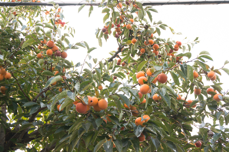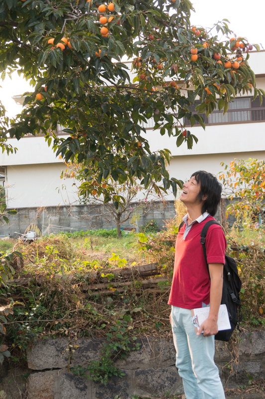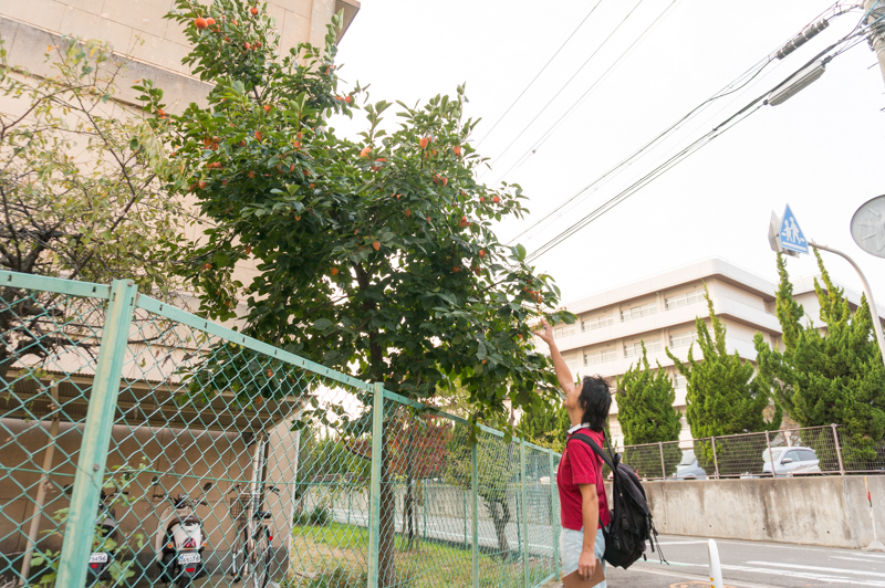 上の柿にギリギリ手が届いていない大西さんの奥の建物は桜丘小学校
