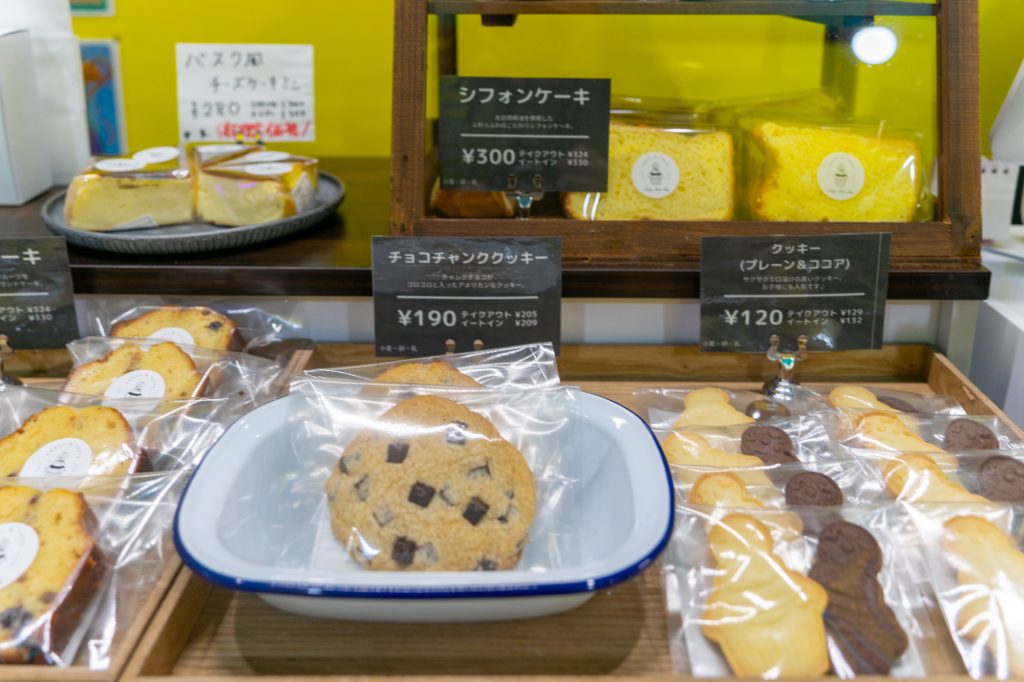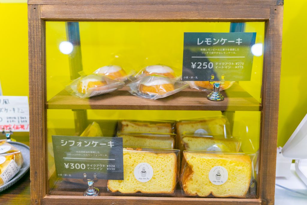 メニューというか商品棚。お店の人にレモンケーキが推しと聞きまして購入。ついでにシフォンケーキ(テイクアウト324円)、チョコチャンククッキー(テイクアウト205円)も買っちゃいました。