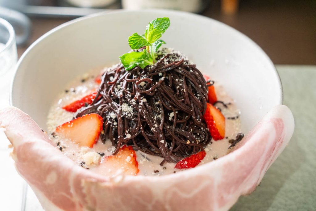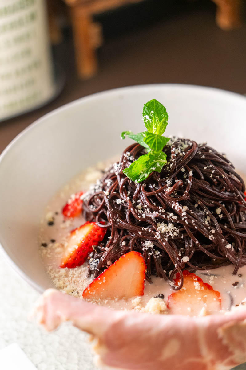そんなわけで取材に伺った時はこの、インパクトがすごい「バンホーテンココア麺の冷製クリーミー苺煮干し」をいただきました!