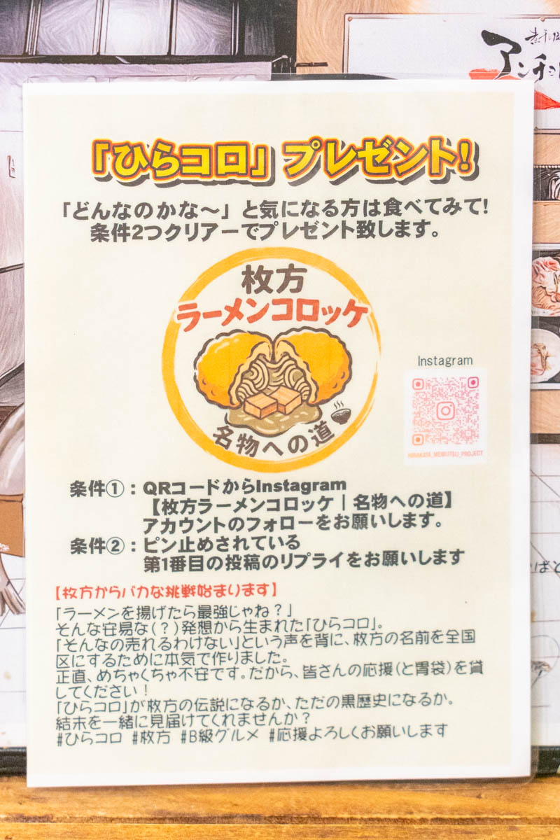CONOBA香里ヶ丘にある「煮干し拉麺 アンチョビー」が、「ラーメンを揚げたら最強じゃね?」という発想から、ラーメンをそのままコロッケにした驚きのメニューを新名物『ひらコロ』として試食を始めたそうです。