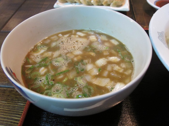 お店によってはスープをバシャっといれて「はいよっ」って返されるだけですが、ここはつけ汁を温めなおしてくれて、しかもお好みの濃さに調節できるようにスープを別の容器で出してくれます。追加のネギつき。(写真ではすでにネギ入れちゃってますw)