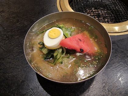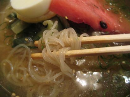 スイカの乗った冷麺というものを初めて見たんですが、帰ってから調べてみたらけっこう普通に乗ってるもんなんですね。韓国では梨とか林檎を入れたりもするみたいです。