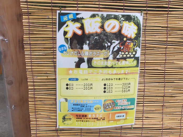 7月は村野月間!今回は村野浄水場のすぐ近くにある「旬彩酒家まろうど」のたこ焼きです。お店の場所はロイヤルホームセンターのすぐ横。