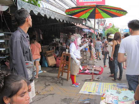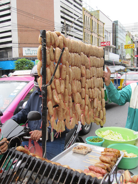 タイ・バンコクの屋台。串に刺して焼いてるので日本でいう「フランクフルト」屋台になるんでしょうけど「ソーセージ串」って感じですね。まぁ一緒のことですけど。