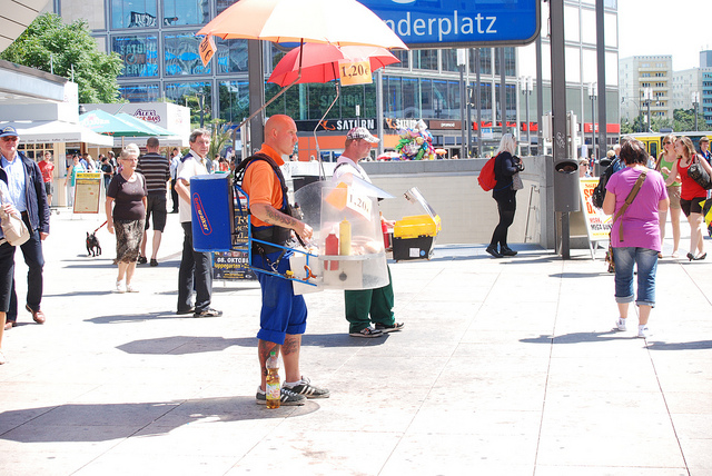 ドイツ・ベルリンのソーセージの売店(?)。日傘もついてて完全装備ですが、こんなの背負って立ちっ放しなんてかなりしんどそうですね。