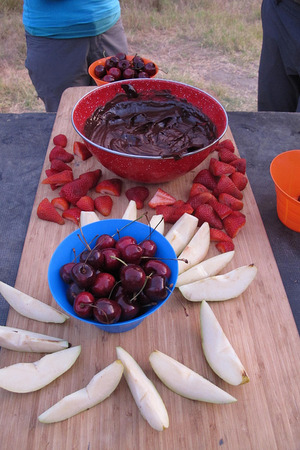 フルーツをチョコにつけて食べるようです。一度でいいから「週末はアウトドアでフルーツをチョコディップして食べたよ」とか余裕顔で言ってみたいです。