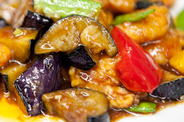 | ■きっちり下処理をしたプリプリの海老を茄子と共にサクッと揚げ上海風の甘辛ソースで炒めました。 ■写真を見てお分かりの様に茄子の角が残ったままでしょう?普通は揚げるとベタッとなるのですが独特の処理を施して炒め揚げ、広東料理の特色を生かして油控えめであっさりと仕上がっています。 |