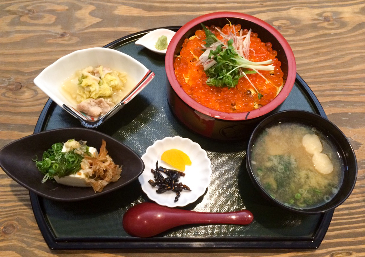いくら丼の他に小鉢2品と汁物と漬物がついていました。