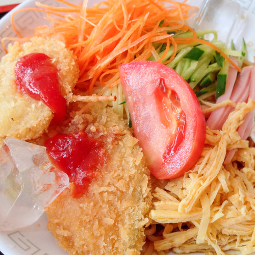 冷麺の上の野菜カツは斬新な見栄え