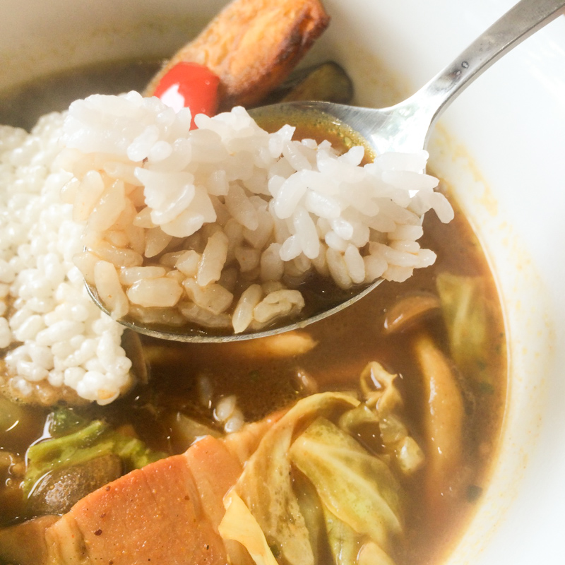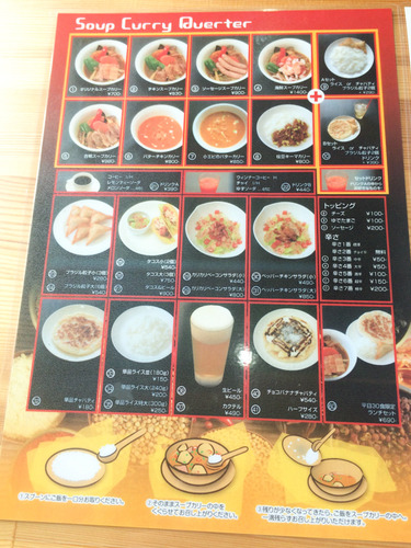 スープカレーはこのようにご飯をスプーンにすくって、それをスープカレーにくぐらせて食べる!とメニューの下に書いてありました。残りが少なくなったらご飯を全部入れちゃって食べます![]()