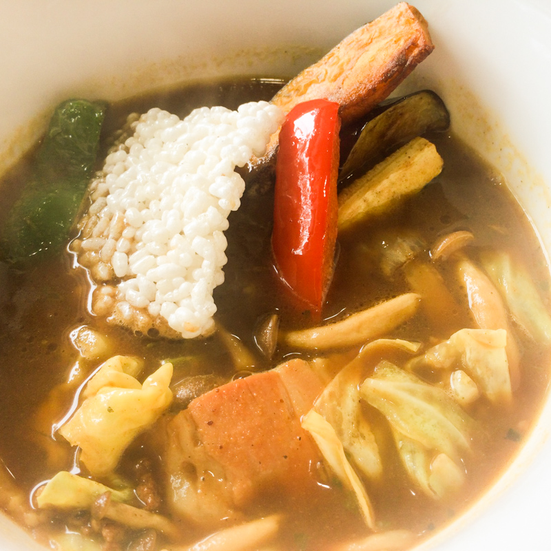 カレーは「オリジナルスープカリー」がベースになっていて、その上にチキンやソーセージ、海鮮などが載っているものもあります。追加のトッピングも可。そのほか枝豆のキーマカレー(これまた気になる!)、タコス、お酒、スイーツもあります。
