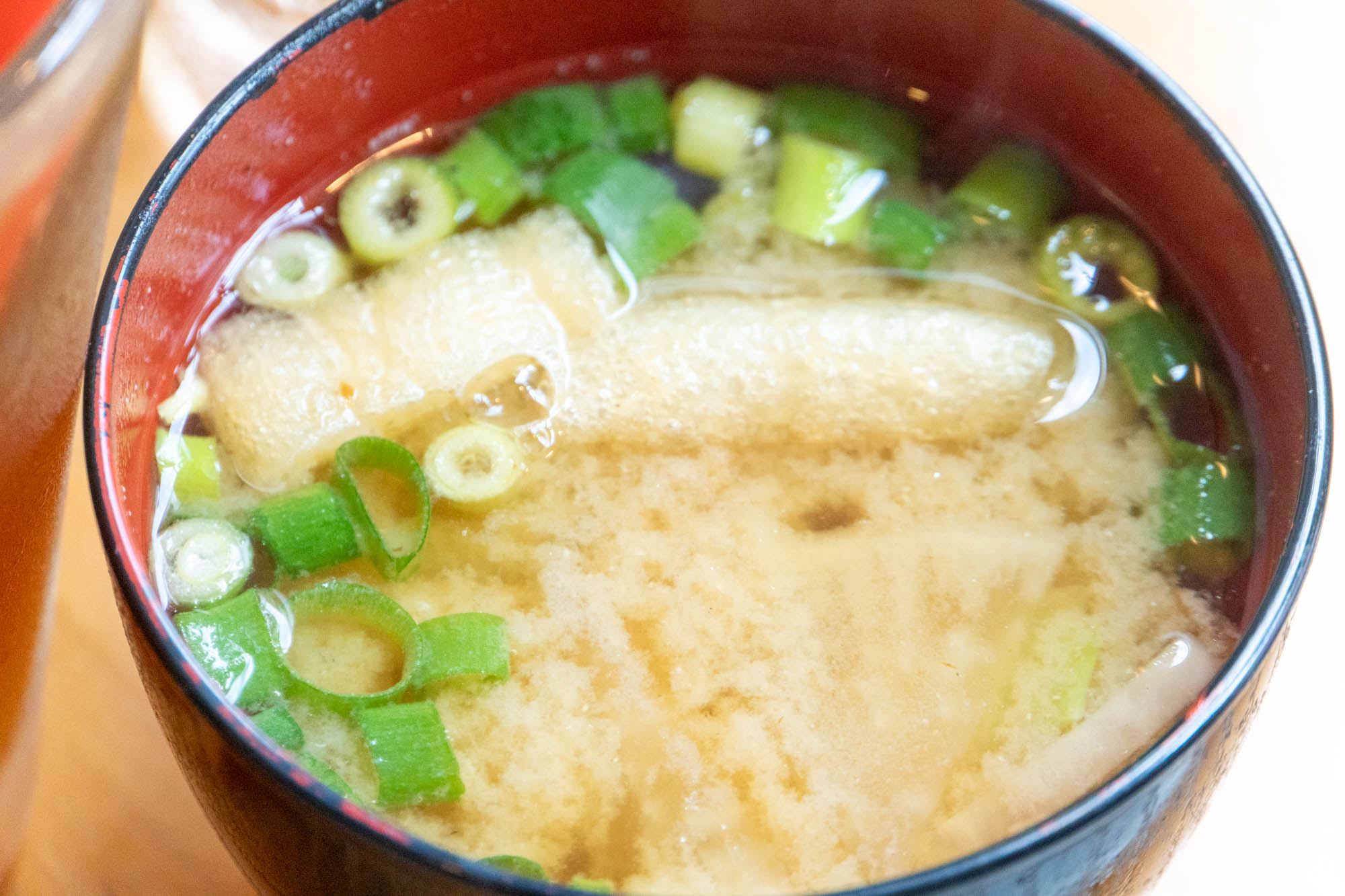 最初に出てくるサラダのドレッシングも美味!お味噌汁も具沢山でめっちゃ染みる!パーフェクト!!