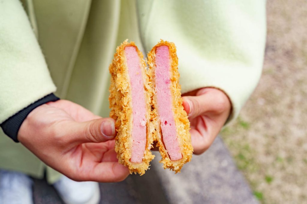 ハムカツ分厚い!これはハムステーキカツやわ。ジューシーやし。