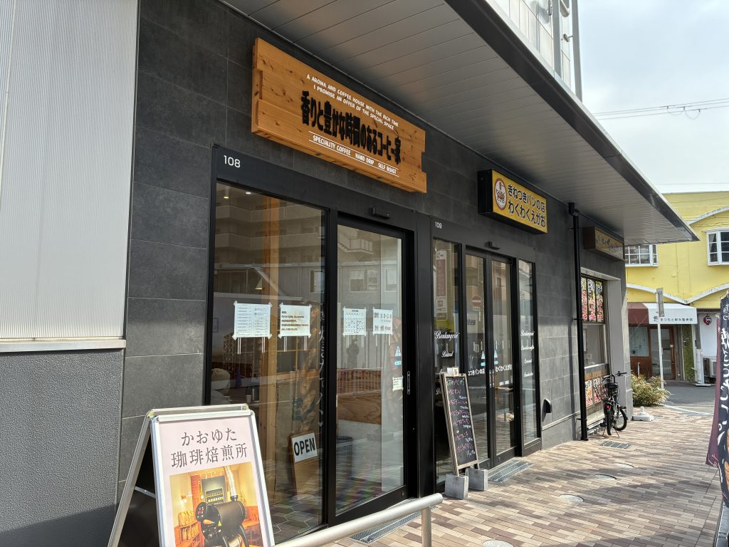 その建物1F外側、写真奥が「きねつきぱんの店 わくわくえがお」というパン屋さん、写真手前が「かおゆた珈琲焙煎所」という自家焙煎コーヒー専門店。