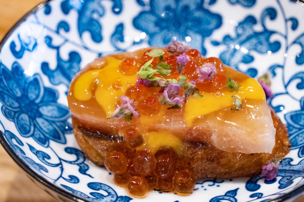 お待たせしました!こちらは「ブリと北海道のイクラのマリネを乗せたブルスケッタ」です。