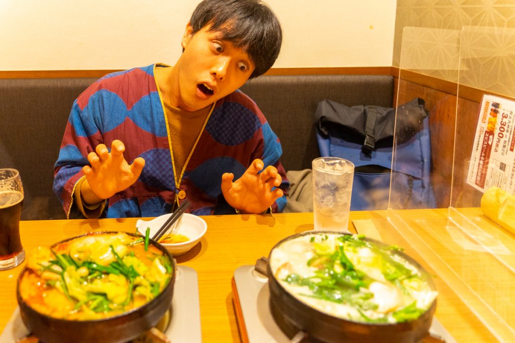 手前が博多赤丸もつ鍋(1949円)、奥が博多白丸もつ鍋(1849円)。