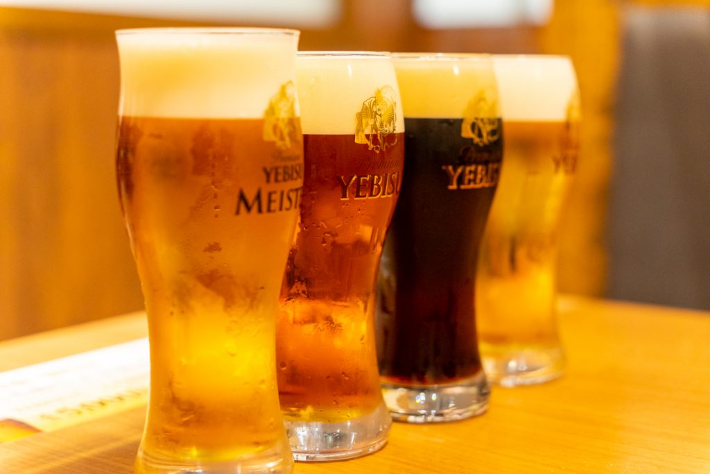 エビスビールを頂きました!手前からエビスマイスター、琥珀エビス、エビスプレミアムブラック、通常のエビスビール。