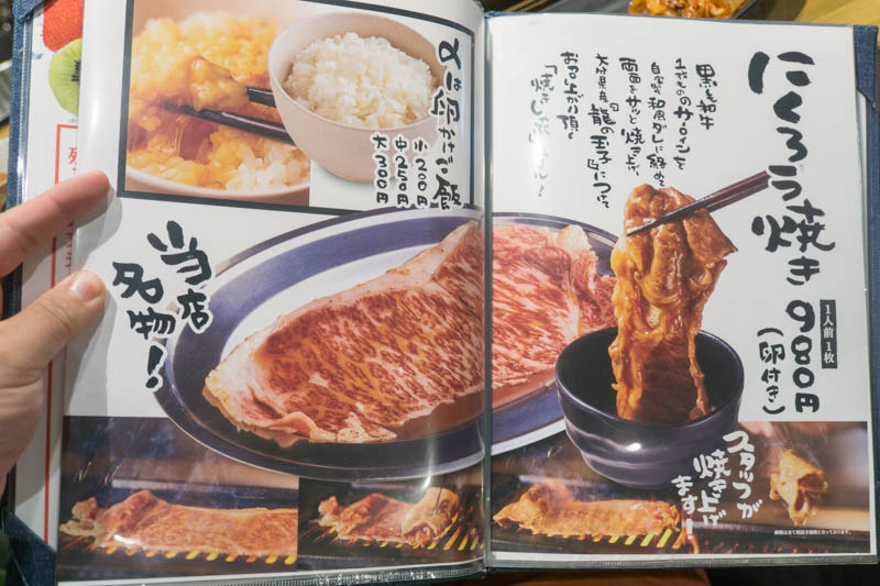 まずは名物のにくろう焼き。スライスされたサーロインを表紙画像の用にファイヤーしゃぶしゃぶし、Café はな膳のグルメでも紹介しためっちゃオレンジな「龍のたまご」につけていただくという、おいしくないわけない組み合わせ。