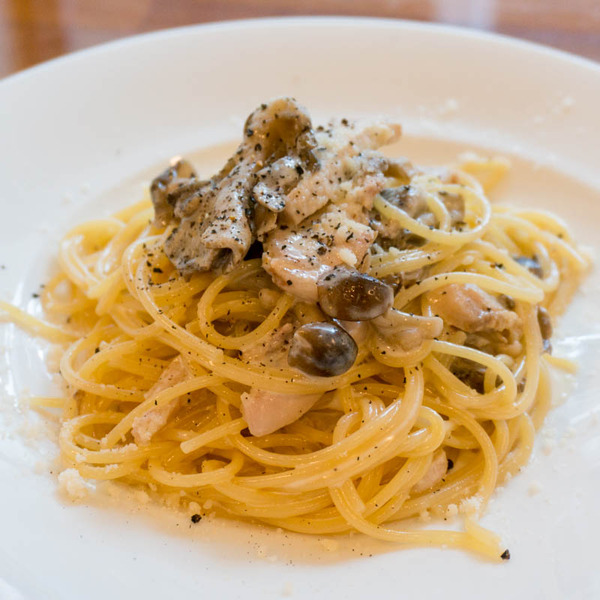 しめじなどのキノコと薄切りの鶏肉が入った濃厚なクリームソースに、モチっとしたパスタがよく絡みます。