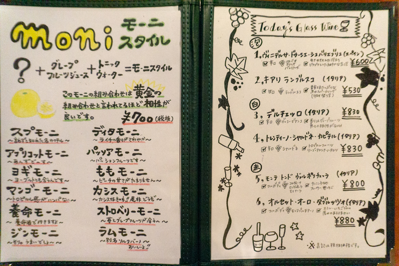 (メニュー:フード・ドルチェビール・カクテル・ソフトドリンク・ウィスキーモー二・ワインサワー・サングリアサングリア