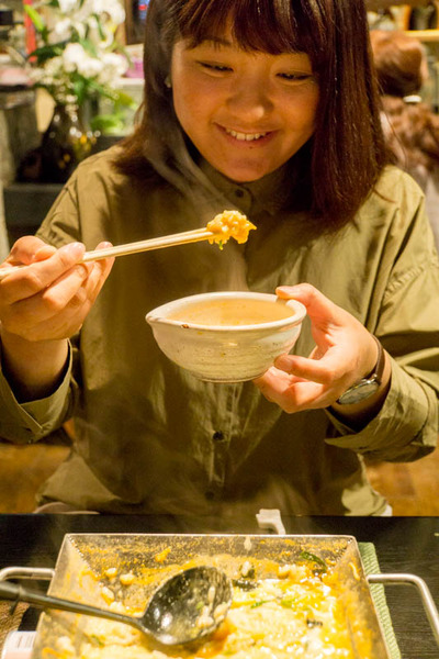 甘辛いオンリーワンな鍋「ぼーちゃん鍋」にごはん、ネギ、チーズ、海苔、そしてタマゴを投入し、これまたお母さんが手際よく作ってくれます。