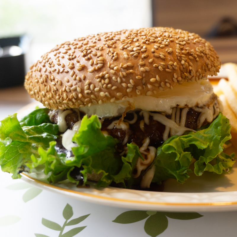 ゴマがぎっしりのバンズに、手作りビーフパテ・目玉焼き・グリーンリーフ・オニオンスライス・テリヤキソース・マヨネーズがサンドされています。