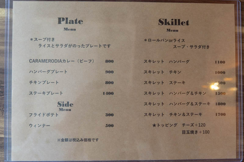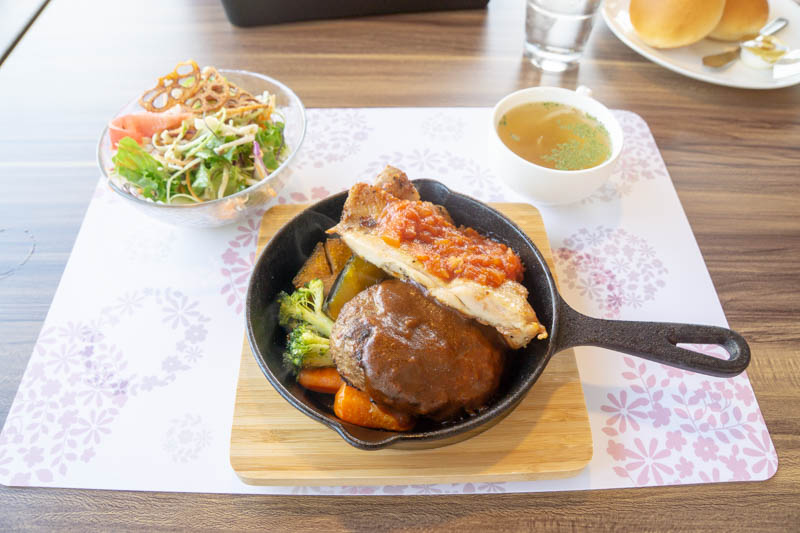 チキンとハンバーグが小さなフライパンこと、スキレットに入れられて運ばれてきました。