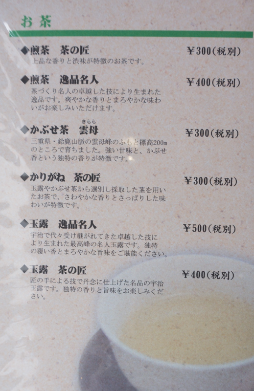 お茶のお店なのでお茶のメニューも豊富。「朝宮香駿」はメニュー表にはありませんが、注文することも可能だそう。